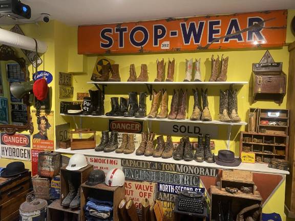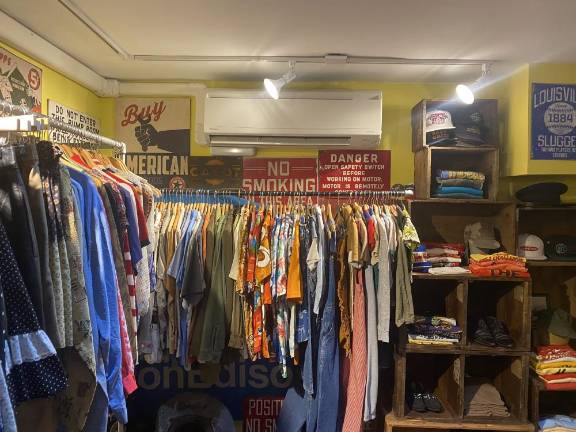 There’s hand-painted script on the glass door with the store’s name and a short tribute to Madeleine. At night, white lettering with the store’s name and a horseshoe logo brighten the sidewalk outside the store. On the entrance walls leading to the retail space, there’s vintage Americana in license plates, posters, a sled, Heineken and Miller High Lite signs and pics of Madeleine modeling vintage clothes. At the foot of the stairs, a bright red Texaco gas tank stands. Music plays old tunes from a 78 vinyl record player. The songs are selected by the store’s manager Sallie Rose who worked at Chuck’s Vintage on the West Coast.