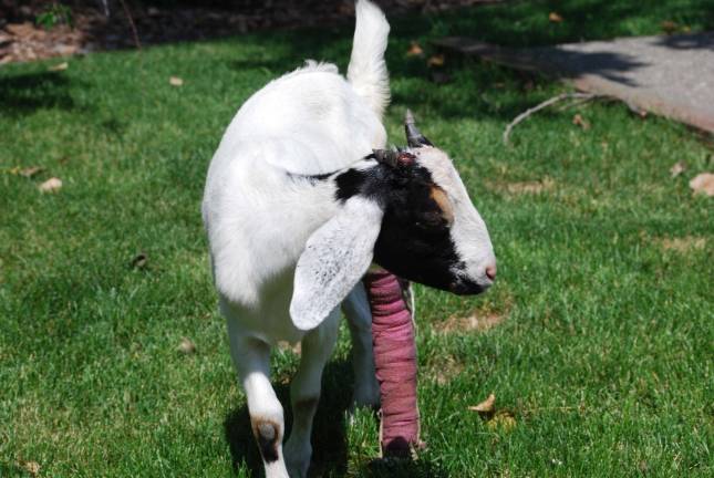 A few mornings after the cast went on, we discovered Charlie with a mysteriously broken horn and a blood-smeared forehead. I wearily flipped through our goat books and, finding nothing on this subject, fired up the computer. Yep, horns can get busted ... some people recommend pain killers and iodine; others, the do-nothing approach. We decidedly did not call the vet. Now we’ve got an asymmetrically-horned goat with a pink cast, who still manages to be really cute.