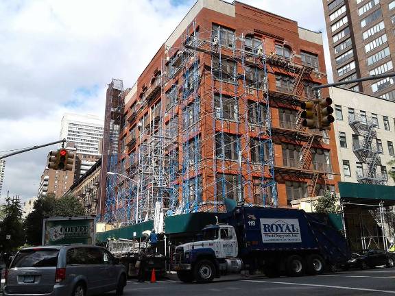 Just home from the hospital — and all I needed to see was scaffolding going up around the building at 81st and East End Avenue. You probably know the one — it houses several dozen rental tenants and a Gristedes grocery store and East End Kitchen.