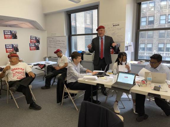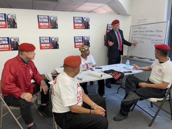 Arnaldo Salinas, one of the original Guardian Angels, has been with Sliwa for 44 years and is part of the team that’s putting together campaign swag like tee shirts, totes, along with info on Sliwa’s positions, and how you can come on board to volunteer. In addition to the nitty-gritty work, there was the campaign staff – Campaign Manager Rob Hornak, Political Strategist Robert Cole, Press, Maria Sliwa, one of Curtis’s sisters, Consultants, Oliver Roberts, Anna Zell, and Office Manager/Consultant James Perrone. When asked about contributions and fundraising, Sliwa was quick to point out that politicos from both parties contribute to the opponents – meaning to competing candidates. To prove it, he mentioned that Brooklyn Dem Leader Frank Seddio contributed $2,000 to his campaign. Sliwa didn’t talk about the big-dollar Republicans who were supporting him politically but fundraising in the Hamptons for his opponent Democrat Eric Adams. Although Sliwa has made it known that he’s no fan of Donald Trump, his loyalty to Rudy Giuliani is steadfast and he tolerates the former mayor’s allegiance to the former president. Giuliani endorsed Sliwa. No mention about a donation.