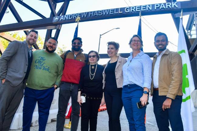 A sign of distinction – A distinctive sign was unveiled for Andrew Haswell Green Park earlier this month by various officials and community leaders. The highly visible sign, designed to increase awareness of the park, was installed on the support structure for the Roosevelt Island tram at the entrance to the park at York Avenue and East 60th Street. Andrew Haswell Green park is a work in progress, and the current phase to enhance the park is now being constructed by the NYC Economic Development Corp. at a cost of $32.7 million. When complete, it will include sloping lawns, a grand staircase and a rebuilt section of the esplanade overlooking the East River. This significant addition of parkland for the East Side will provide a gathering place for people to relax and enjoy the waterfront.