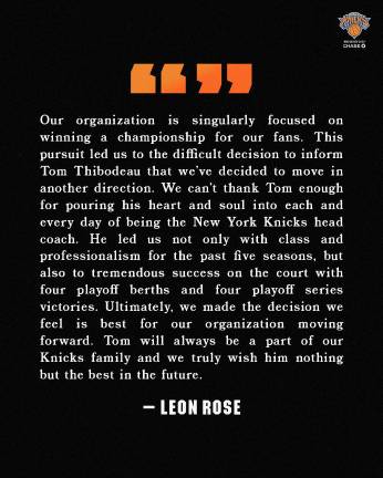Granted, it was not an easy or obvious decision to discard Thibs. His fans correctly point out that under him the Knicks just had their most successful season in 25 years.